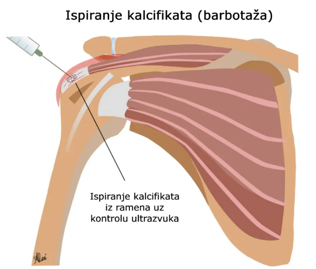 Na čistu kožu se nanosi sterilni ultrazvučni gel, a zatim se tanka igla pažljivo uvodi kroz kožu, sve pod stalnim nadzorom ultrazvuka. Prvo se daje lokalni anestetik kako bi se područje oko kalcifikata anesteziralo i postupak bio što ugodniji za pacijenta.